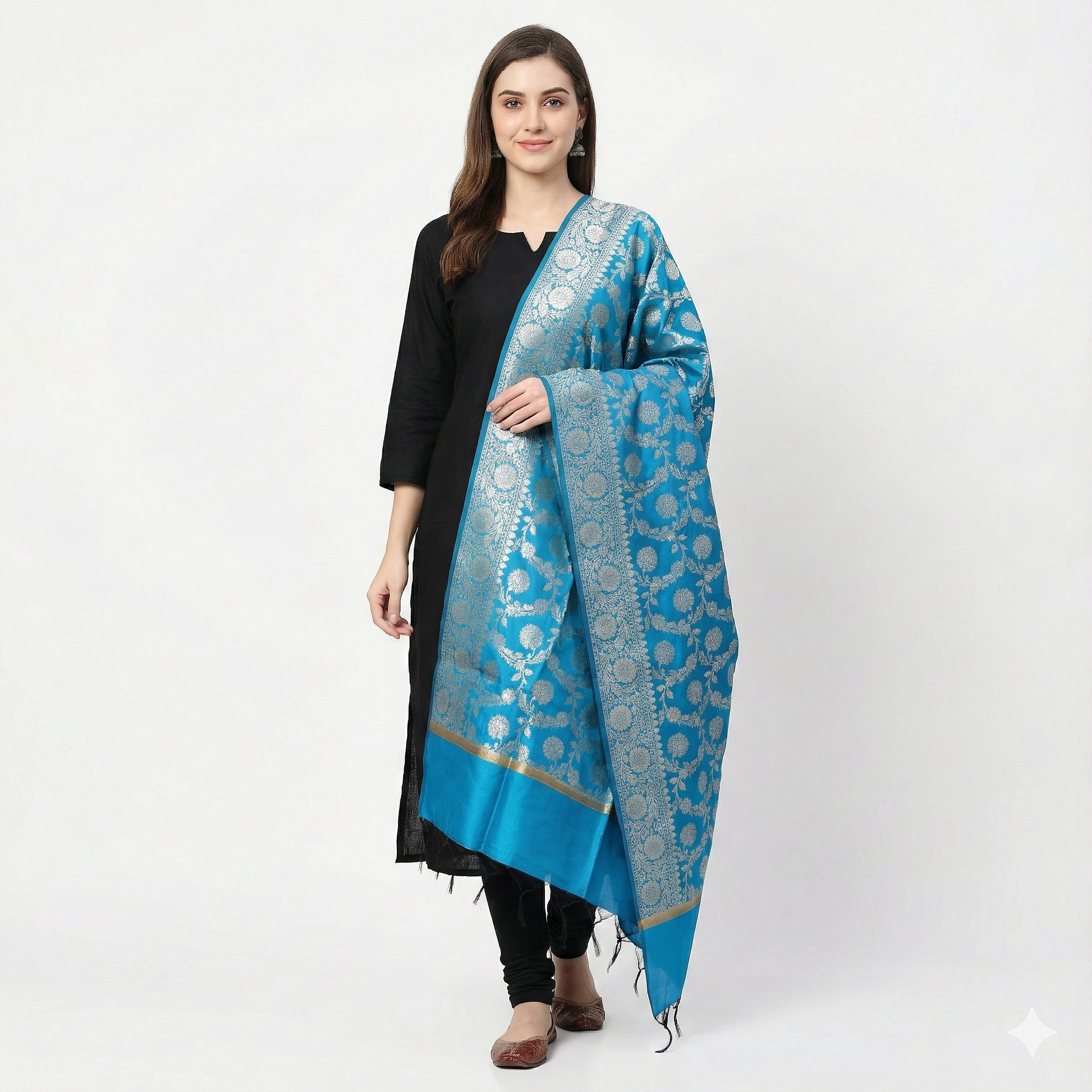 Light, refined, and intricately detailed, this sky blue Banarasi silk dupatta features elegant jali work that adds texture through precision rather than excess. The openwork pattern creates depth while allowing the silk’s natural sheen to surface softly, giving the piece an airy, graceful presence.
