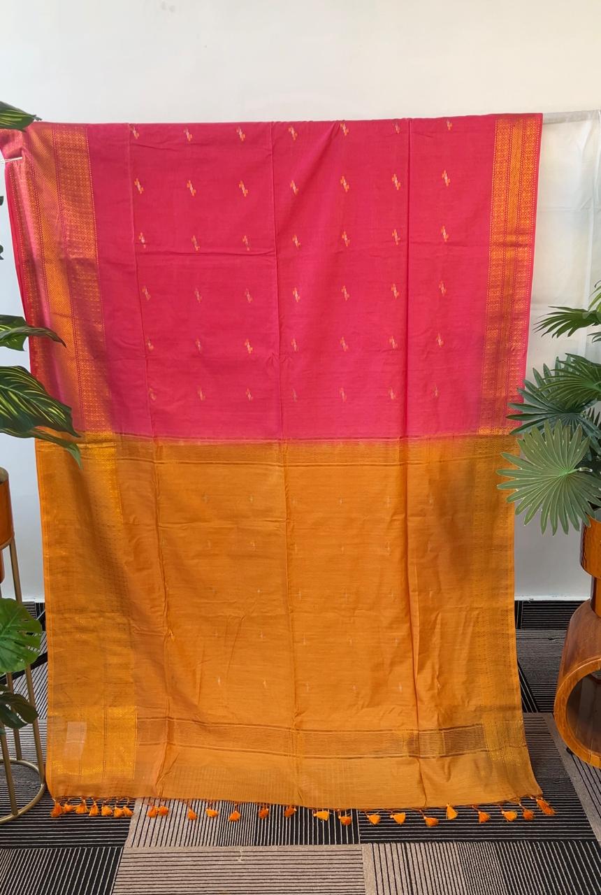 Fresh, vibrant, and rooted in everyday elegance, this soft cotton saree pairs a warm yellow base with a striking pink contrast, finished with delicate golden zari booti detailing. The motifs add just enough shimmer to elevate the saree without taking away from its breathable, easy-going nature.