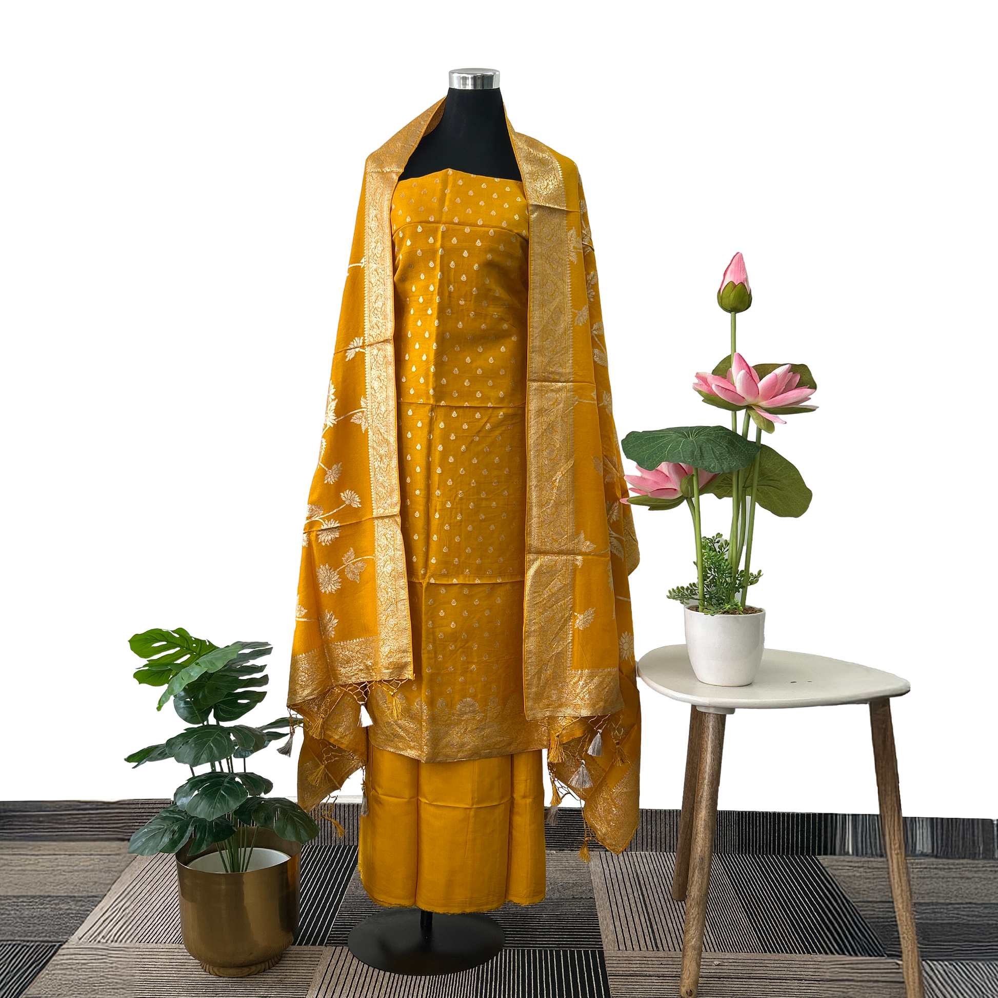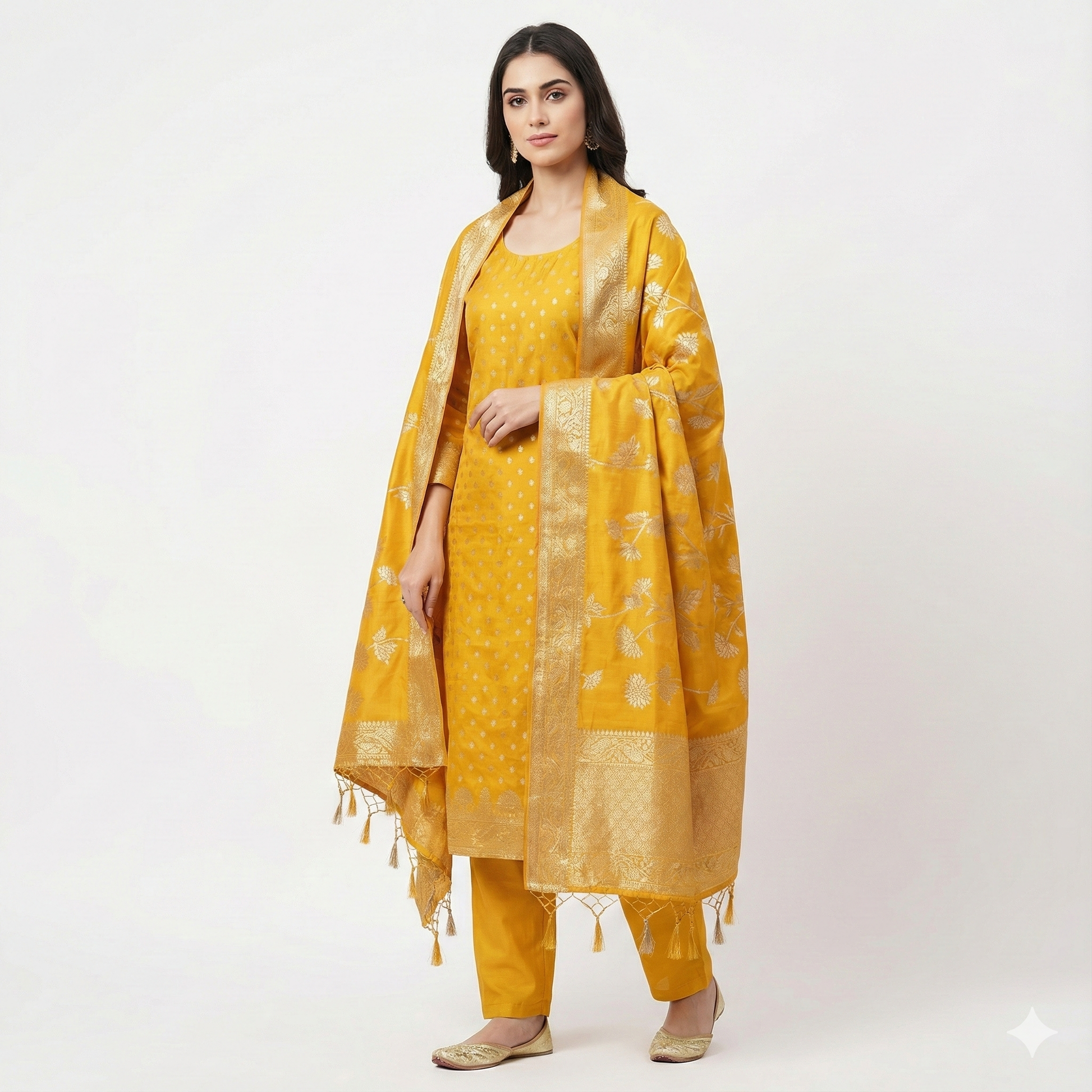 Vibrant yet grounded, this mustard yellow dola silk Banarasi suit set brings together traditional craftsmanship and confident colour. The rich tone is balanced by classic Banarasi motifs, woven with precision to add texture and depth without overwhelming the silhouette. It’s festive, but refined.